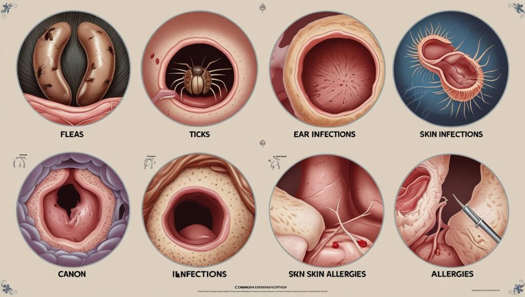 Common Dog Illnesses Many dogs suffer from skin allergies caused by food, environmental factors, or flea bites.